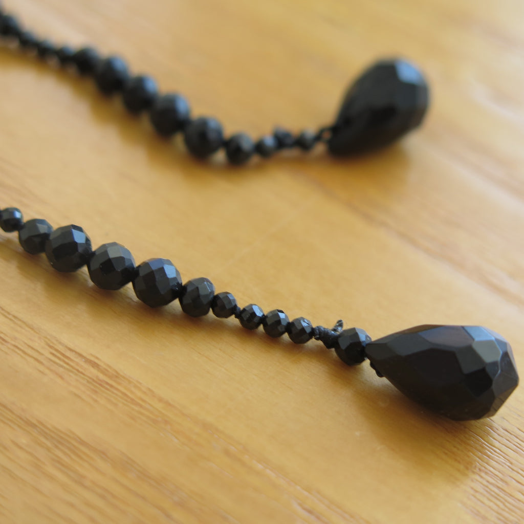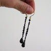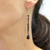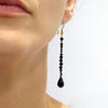 Long drop pendulum earrings with sparkling black Spinel beads. Knotted silk thread with silver hooks that are securely soldered so that it will never turn loose or open.