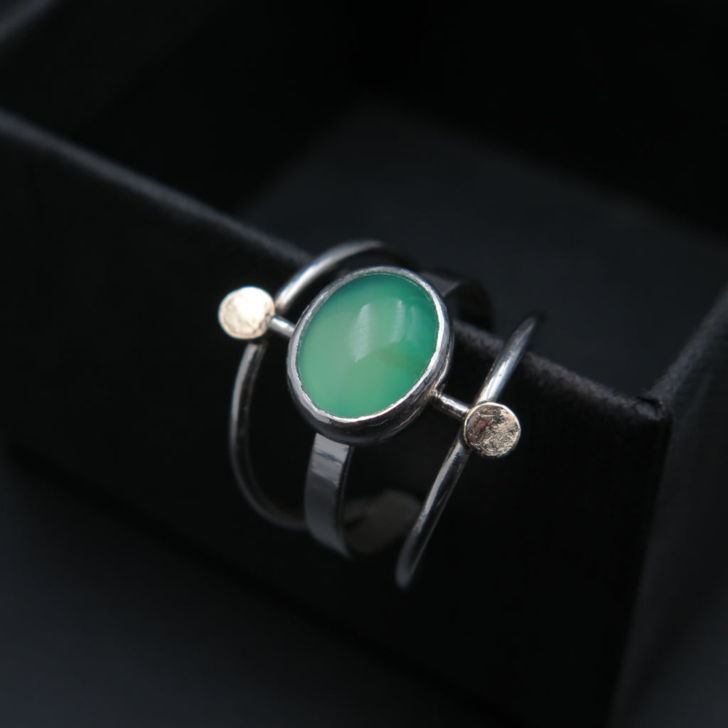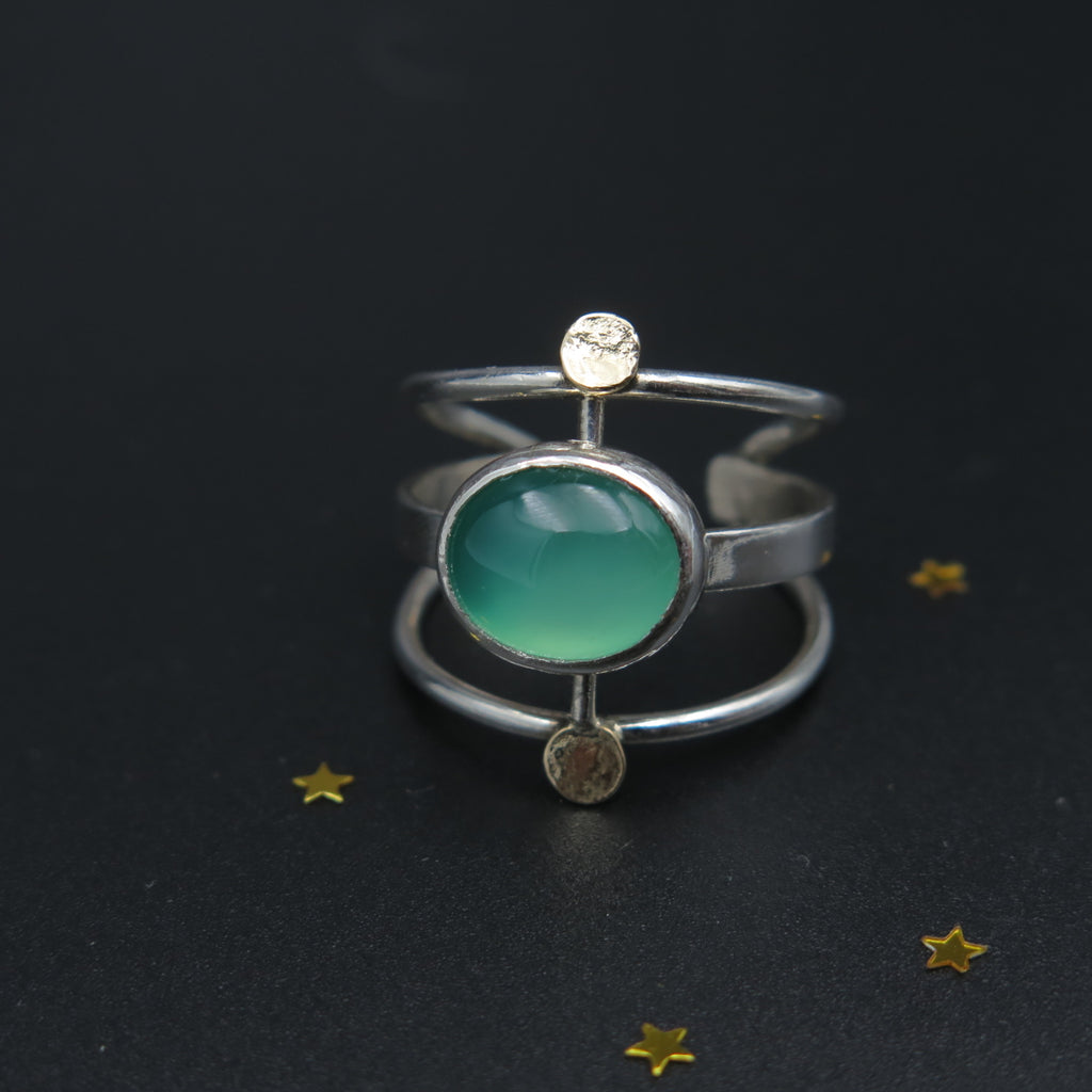 One of a kind fine ring handmade with a green Agate gemstone, silver and 14K recycled gold disks. Bold design that catches all the eyes.
