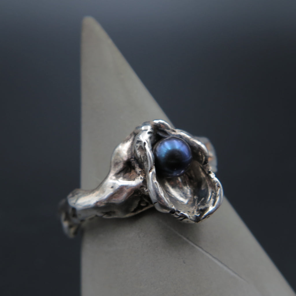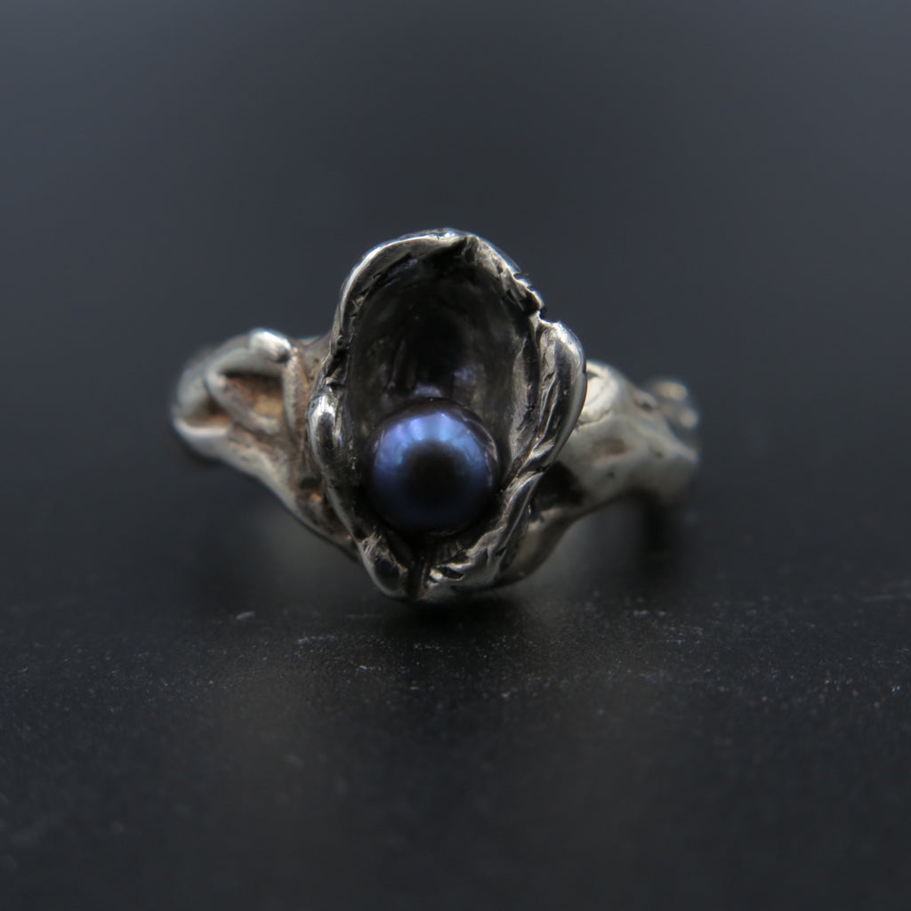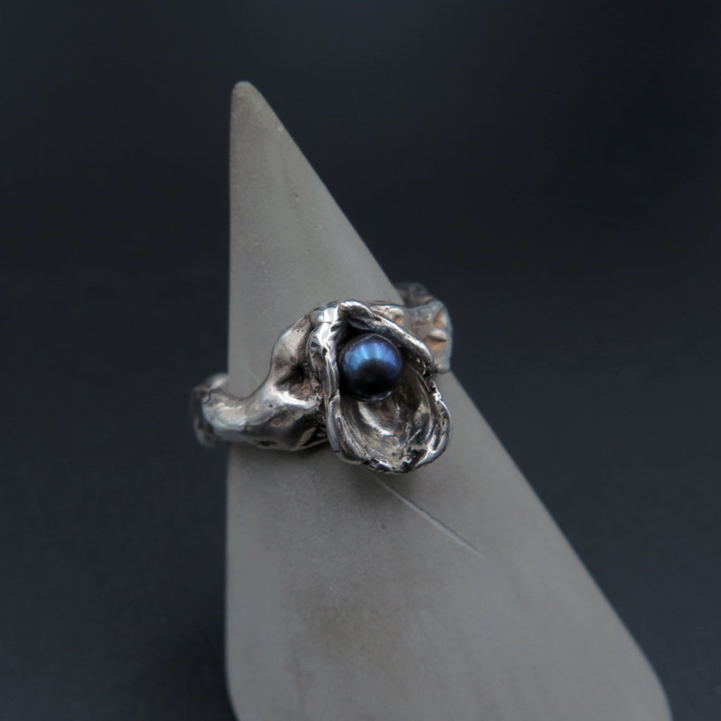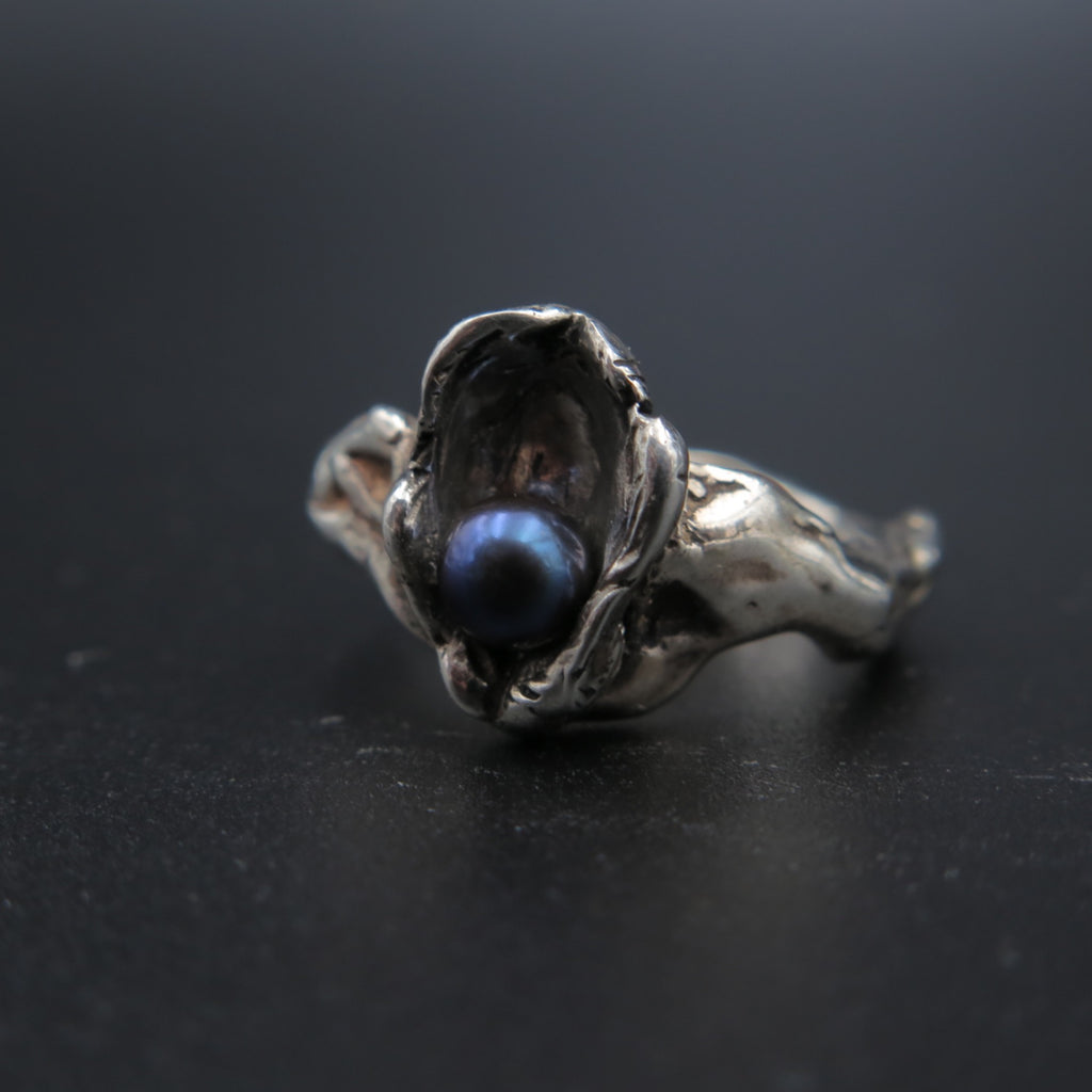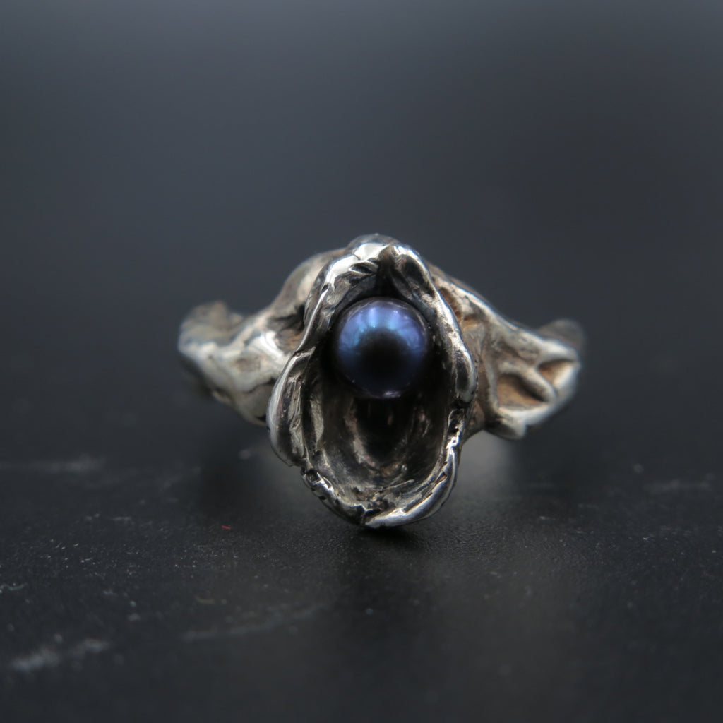 Sculptural Mujer Ring made with the ancient lost wax technique where each one is one of a kind piece. Inspired by fairy tails, it is shaped as woman's vulva treasuring a purple sweet water Pearl.