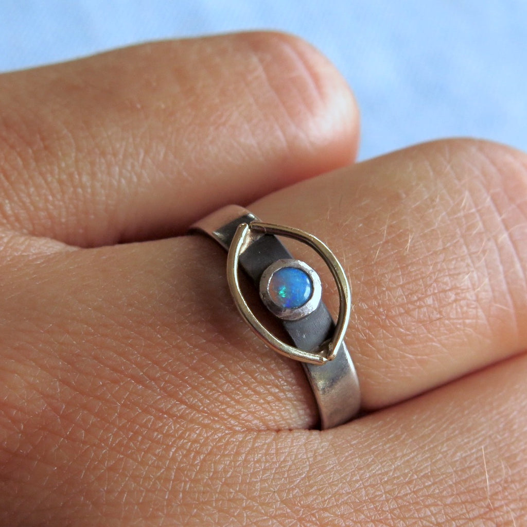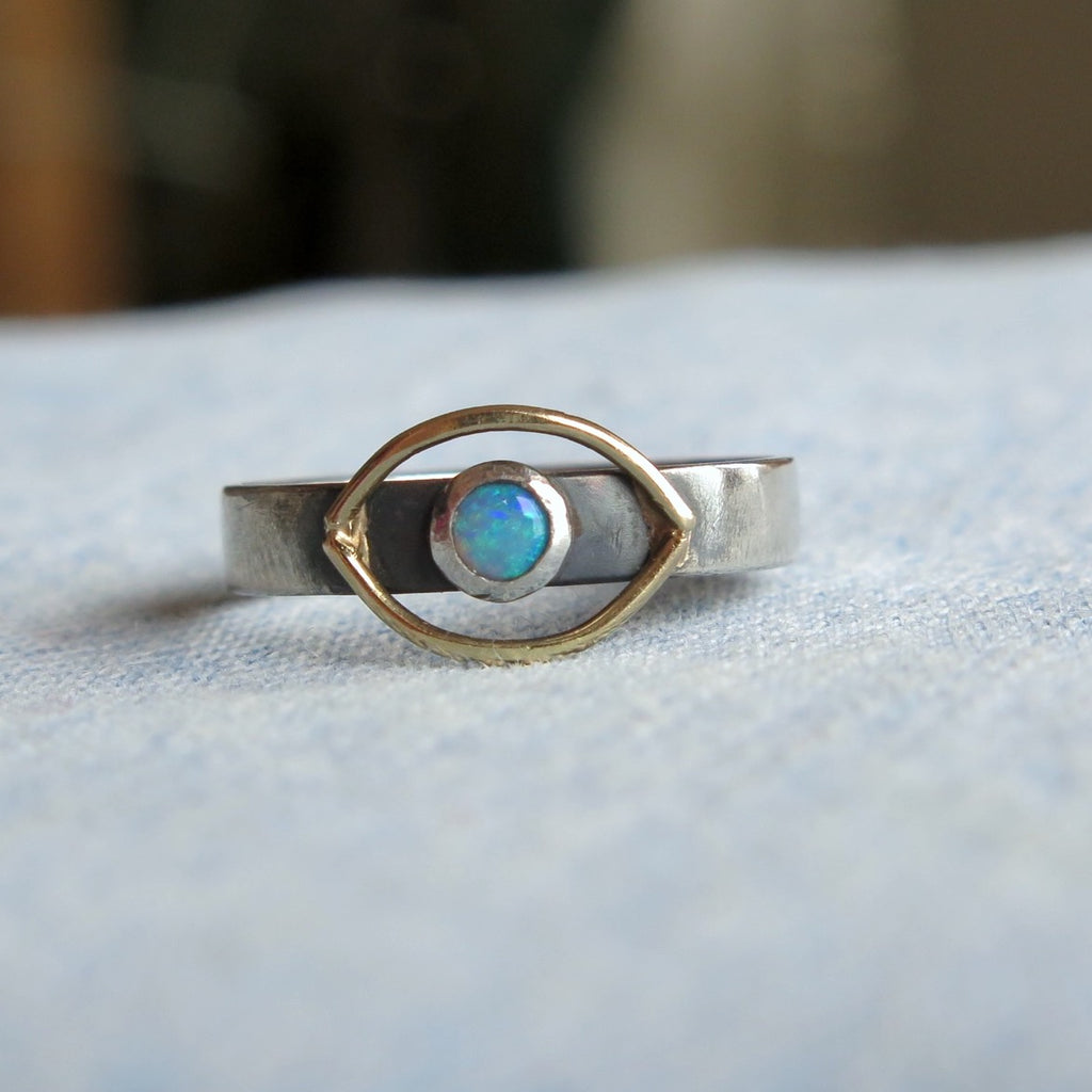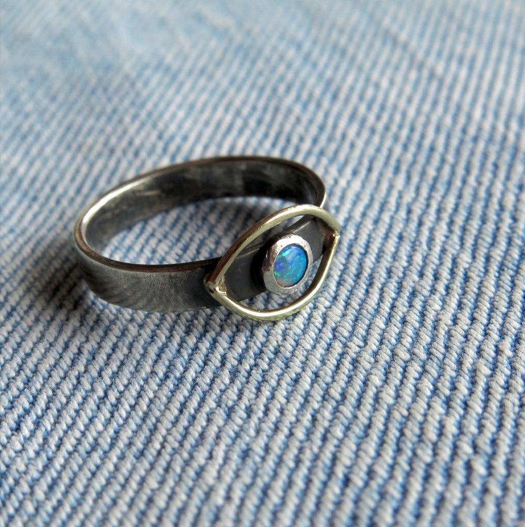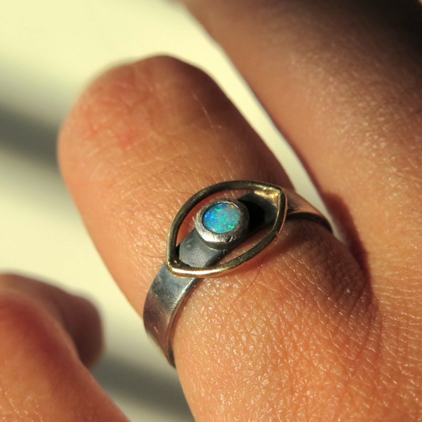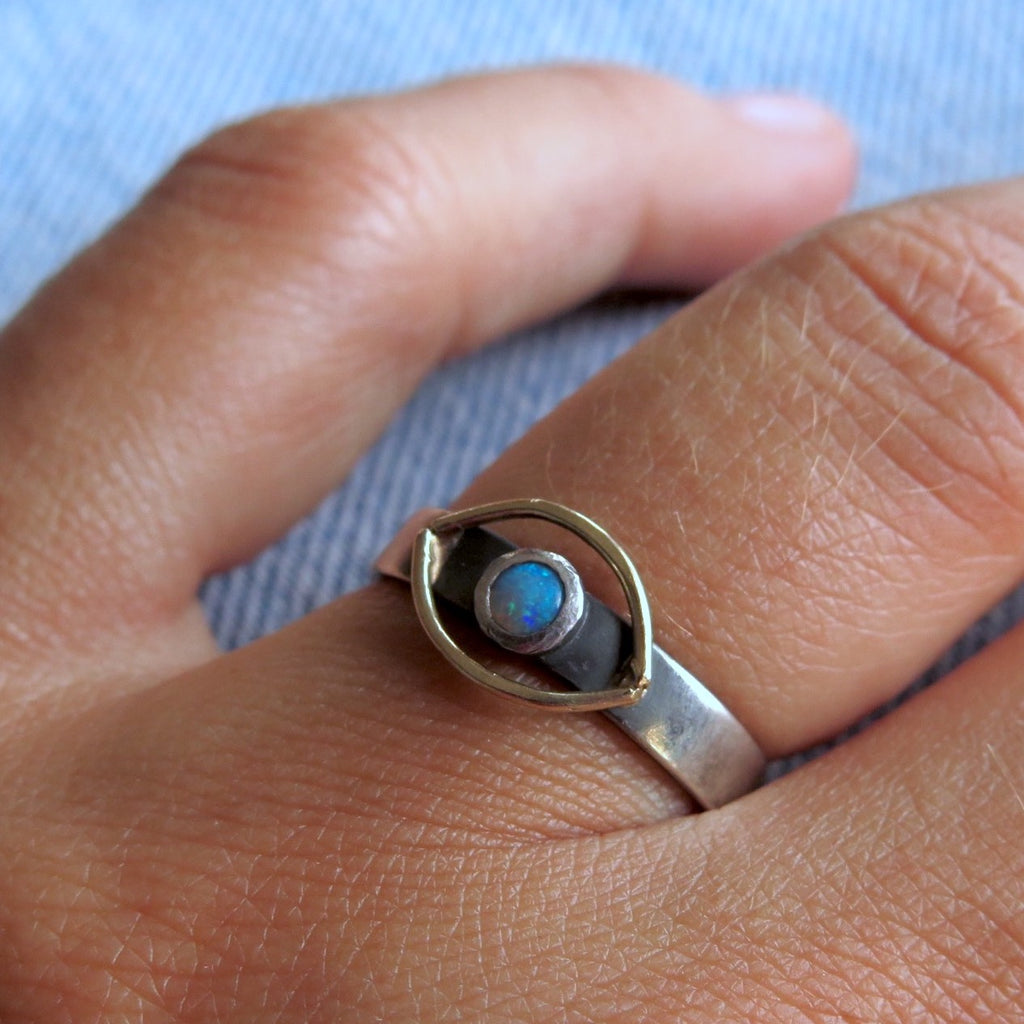 The Cosmic Eye Signet ring handmade with sterling silver and a solid 14k gold halo eye on top, featuring a mesmerising Opal gemstone. Inspired by the Evil Eye symbol, a talisman of protection and good energy from the Greek culture.