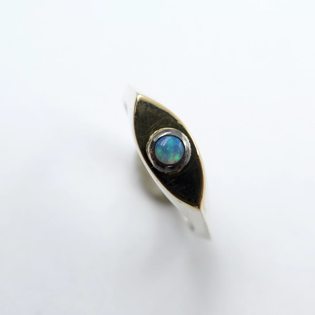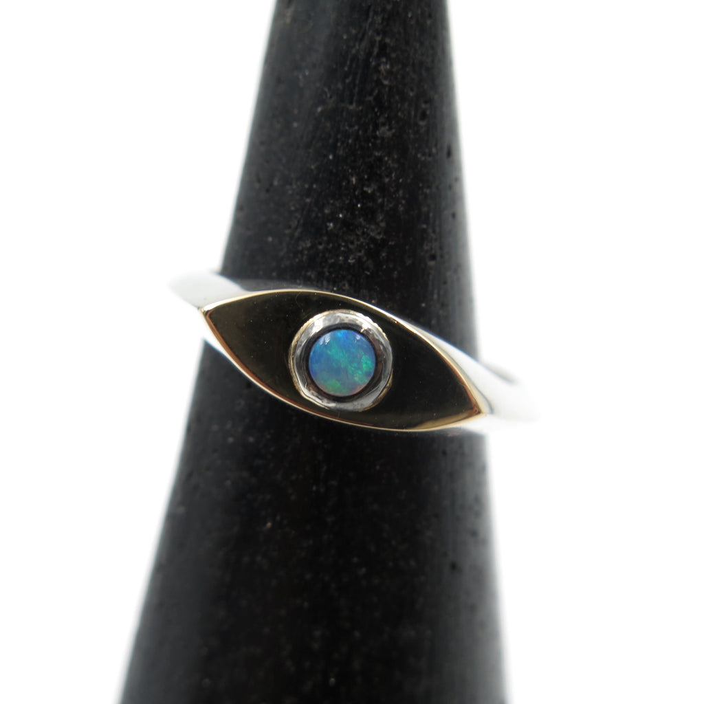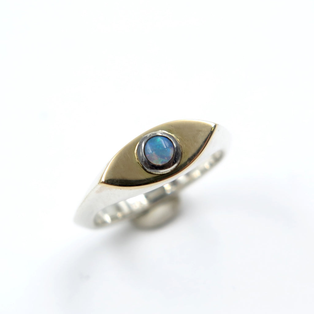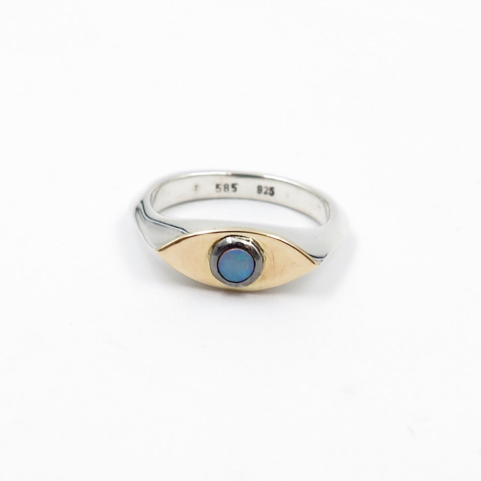 The Supreme Eye Signet ring handmade with sterling silver and a solid 6 mm layer of 14k gold on top, featuring a mesmerising Opal gemstone. Eye Signet ring, inspired by the Evil Eye symbol, a talisman of protection and good energy from the Greek culture.