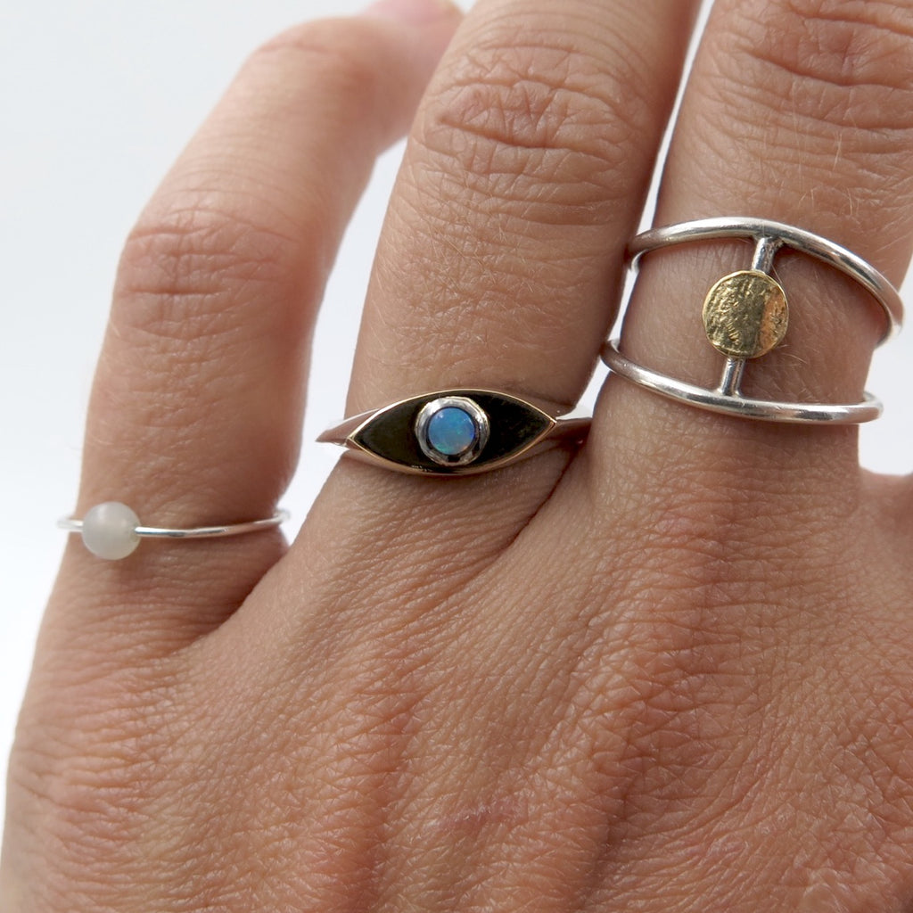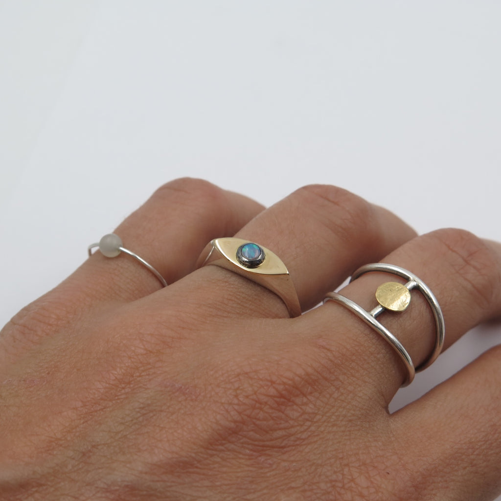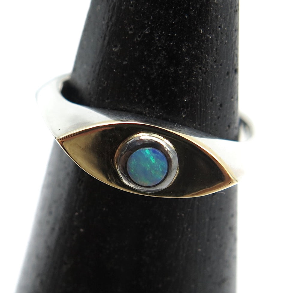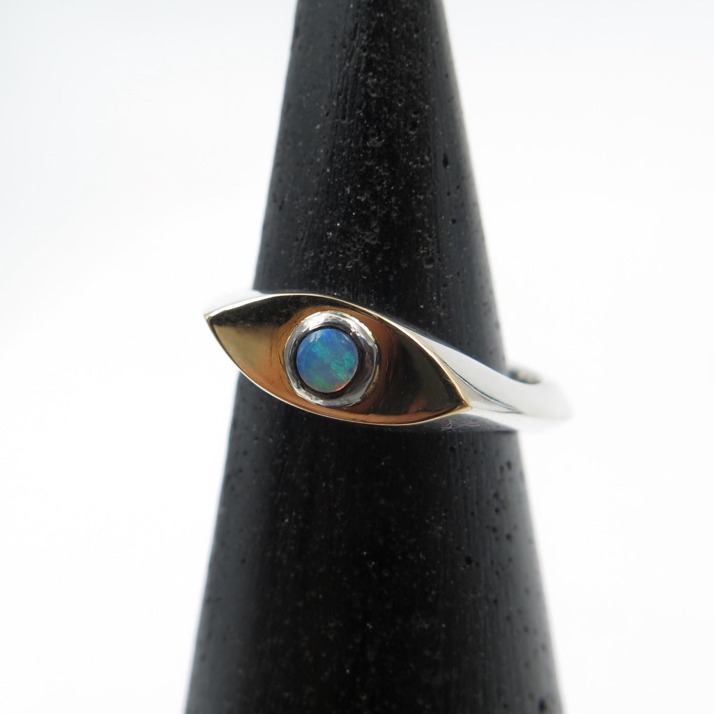 The Supreme Eye Signet ring handmade with sterling silver and a solid 6 mm layer of 14k gold on top, featuring a mesmerising Opal gemstone. Eye Signet ring, inspired by the Evil Eye symbol, a talisman of protection and good energy from the Greek culture.