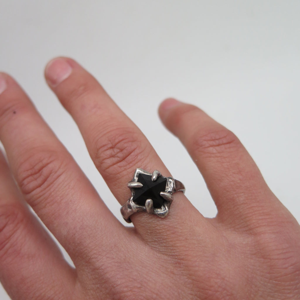 Sculptural Black Lord ring made with the ancient lost wax casting technique especially for this specific stone. A brutalist edgy ring with a faceted Onyx gemstone set in solid silver with dramatic shaped prongs. Romantic gothic style with grunge organic details perfect for an alternative solitaire and engagement ring.