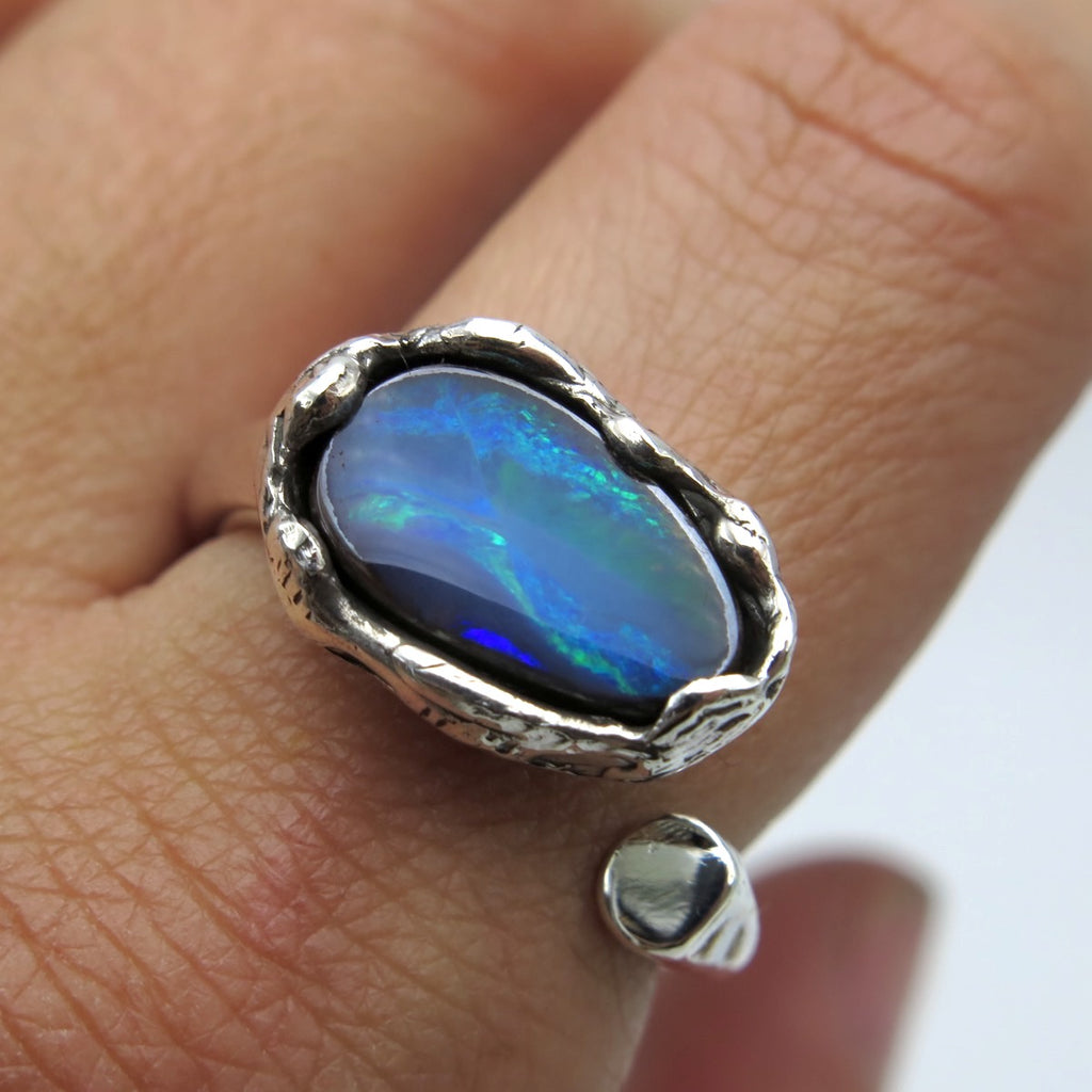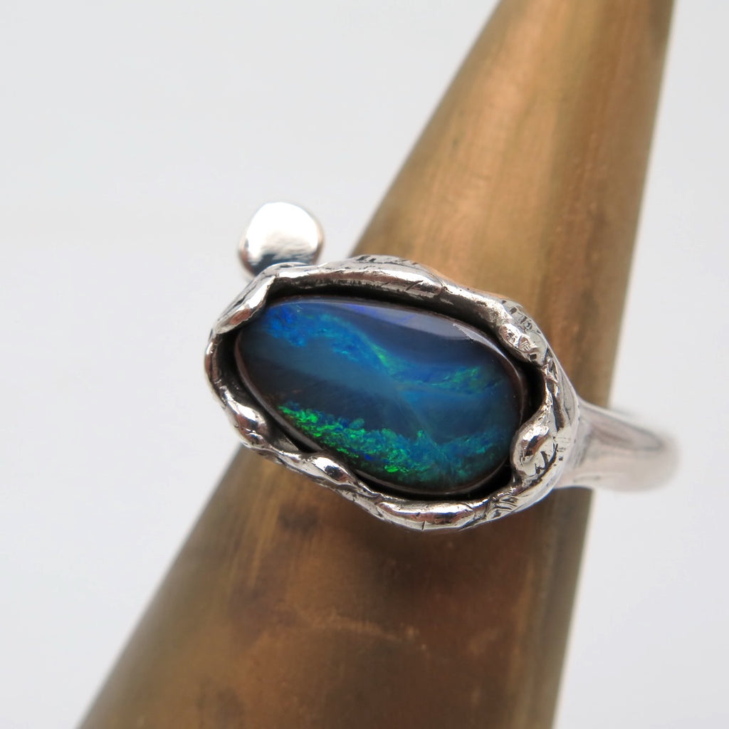 Inspired by the mysterious depths of the ocean, this sculptural statement ring showcases a mesmerising natural Australian Opal with shifting hues of blue and green.