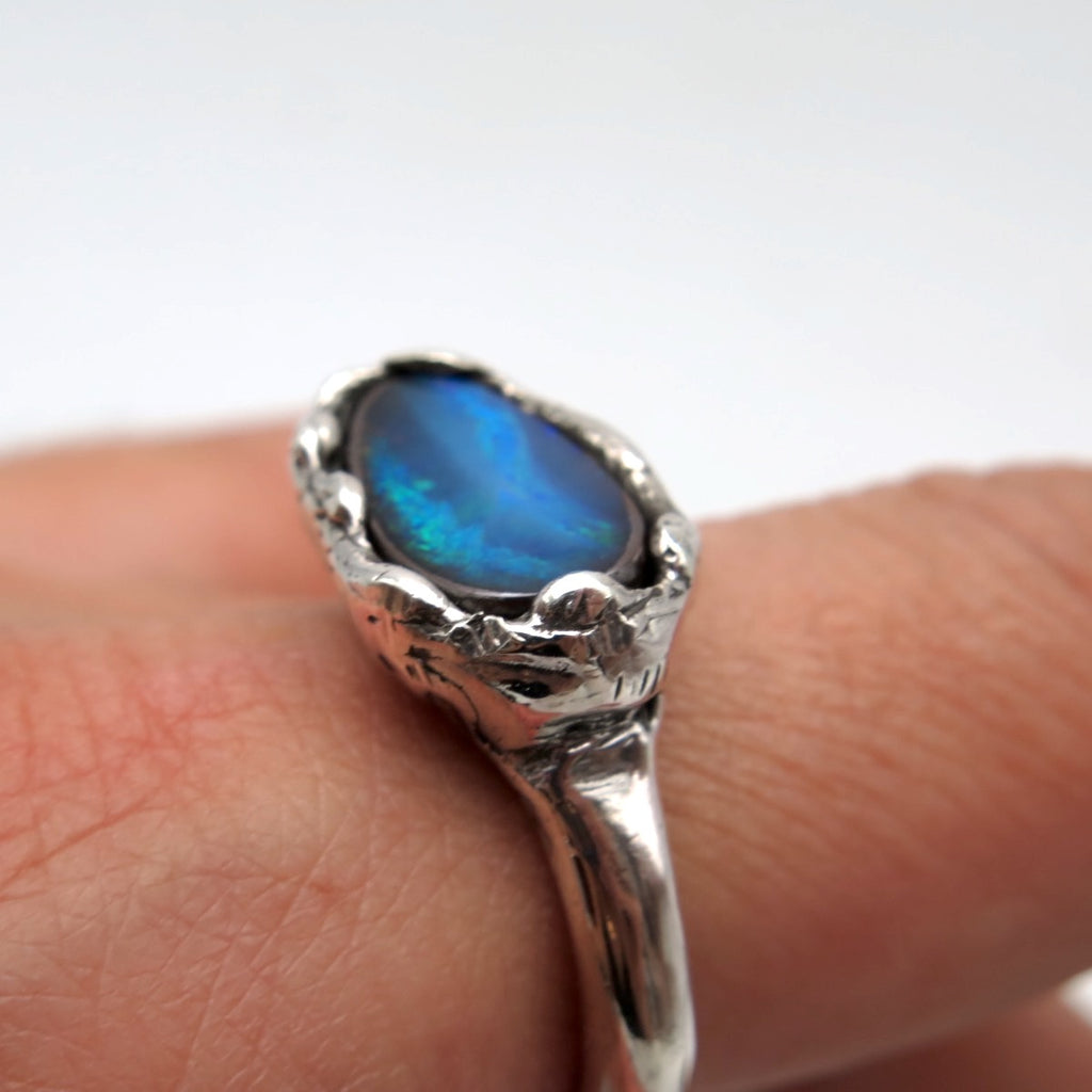 A true one-of-a-kind creation, the ring is meticulously handcrafted using the lost wax carving technique, designed specifically for this unique gemstone. Cast in sterling silver, its organic form features a bold, textured band and wave-like prongs that embrace the opal like seafoam curling around a treasure.