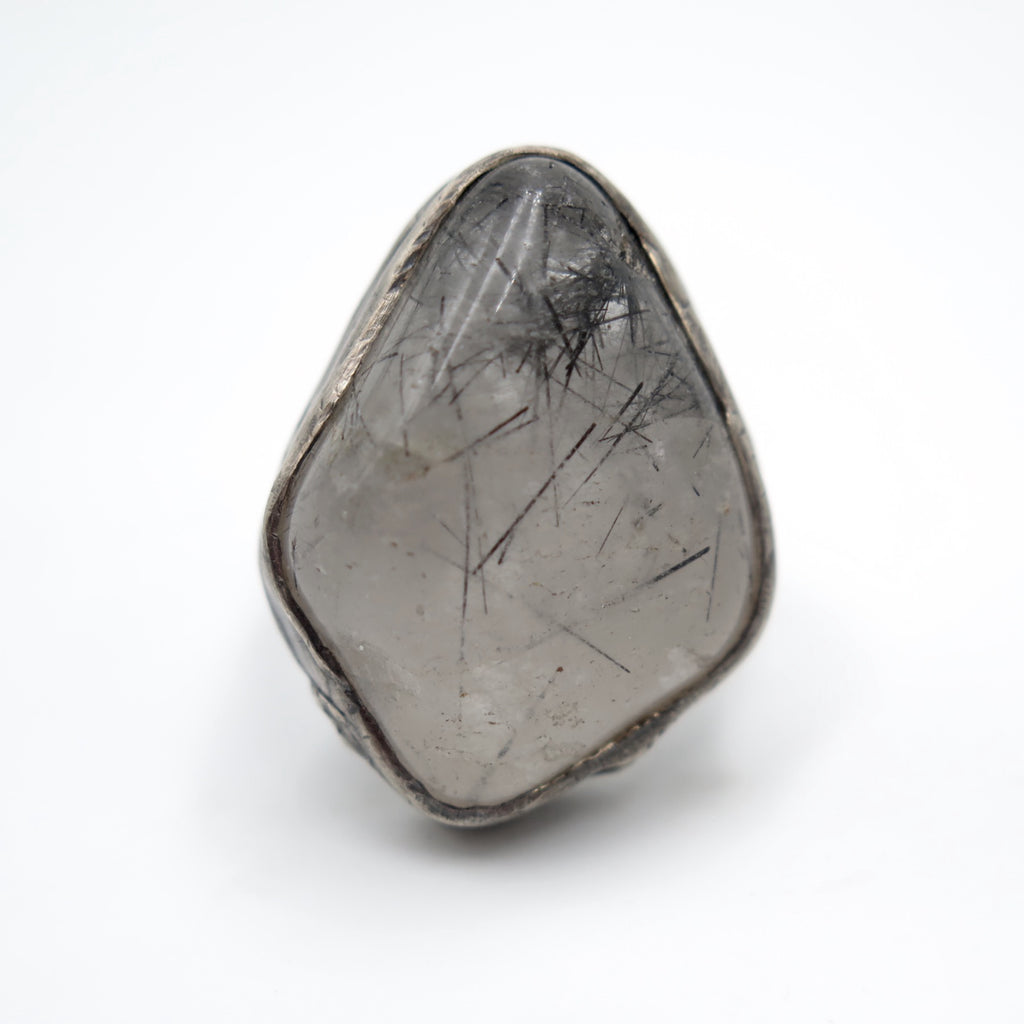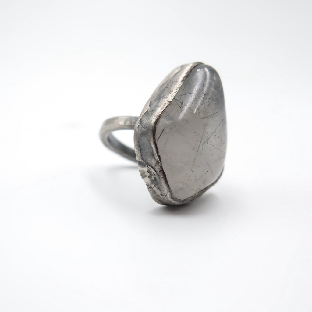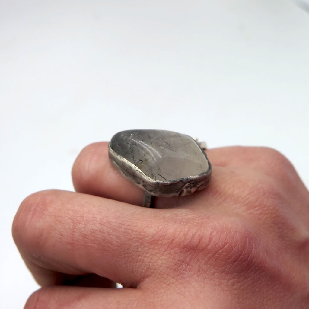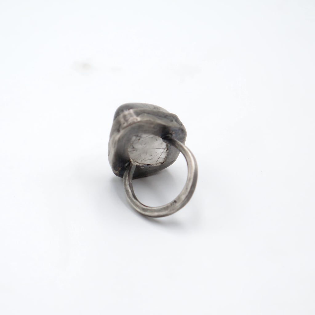 One of a kind ring made with the lost wax carving technique especially for the specific stone. Statement ring handmade in oxidised silver with a special Rutilised Quartz.