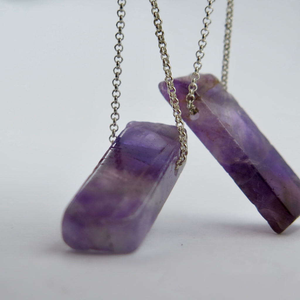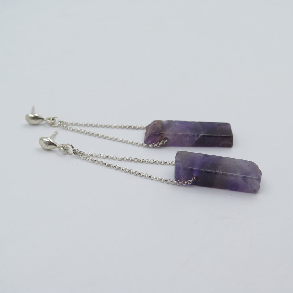 Natural Amethyst stones hanging discreetly with silver chain from little silver drop studs. Wear this minimal boho design with its necklace and get ready to rock!